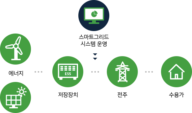- -신재생에너지 및 발전소에서 생산된 전력을 대형전지에 저장해두어 전력이 가장 필요한 시기와 장소에 전송하여 에너지 효율을 높이는 시스템
